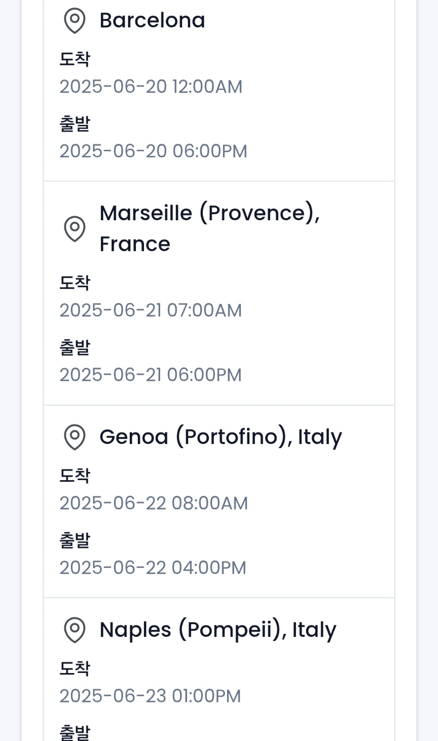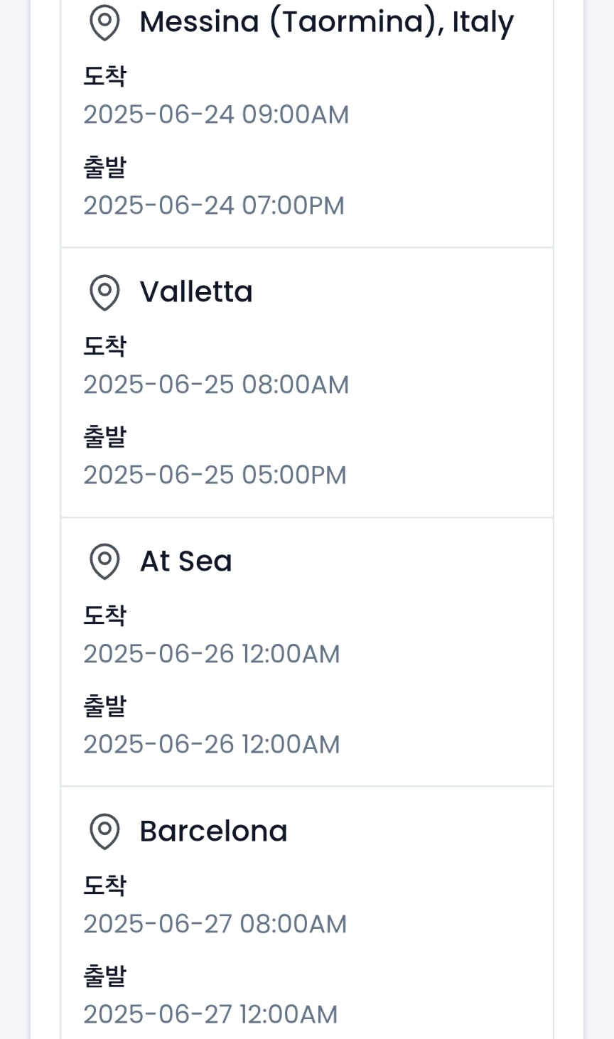 ✅ 기항지: 바르셀로나 → 마르세유(프랑스) → 제노아(이탈리아) → 나폴리(이탈리아) → 메시나(이탈리아) → 몰타 → 바르셀로나